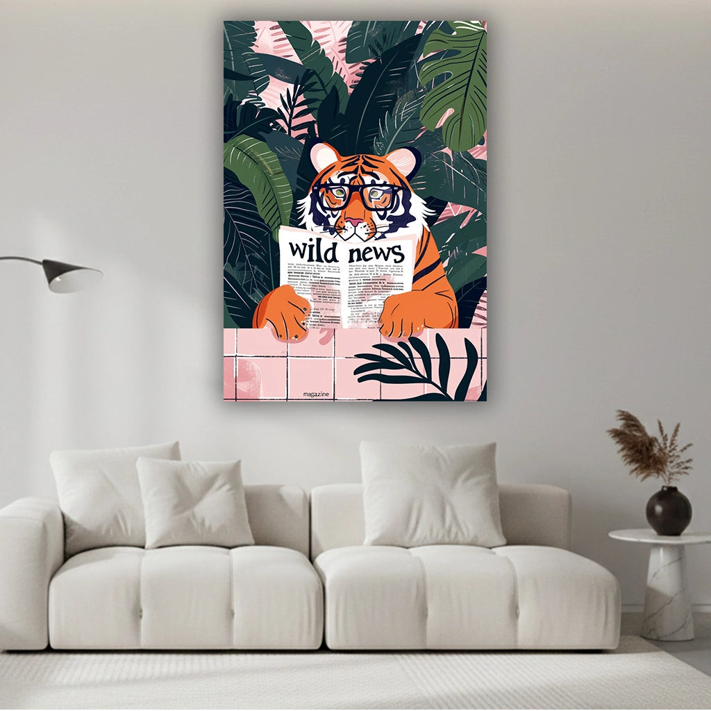A witty and charming illustration that blends jungle life with everyday human habits, featuring a curious tiger calmly reading the morning paper amid lush tropical foliage. The playful contrast between wilderness and routine creates a lighthearted narrative that feels both modern and imaginative, perfect for spaces that embrace creativity and humor.