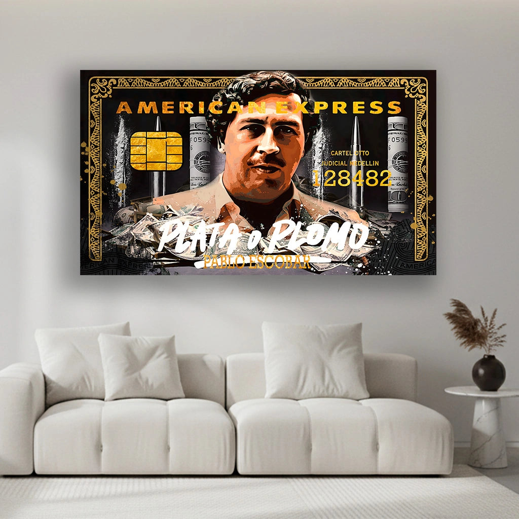 This artwork transforms a luxury-style card design into a dramatic portrait of influence, danger, and moral tension. At the center stands a stern, commanding figure set against a backdrop of metallic textures, ammunition imagery, and ornate golden details. The composition blends street-art grit with opulent aesthetics, creating a striking contrast between wealth and intimidation. Bold lettering, sharp highlights, and layered textures give the piece an edgy narrative feel that instantly captures attention.