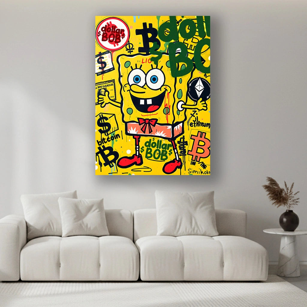 This lively and humorous artwork brings a playful twist to the fast-paced world of digital currency. A cheerful yellow sponge character stands front and center, surrounded by bold crypto symbols, graffiti tags, and neon splashes that amplify the frenzy of modern money culture. With its energetic colors, street-art flair, and tongue-in-cheek personality, this piece captures the fun, hype, and hustle of the crypto era in a uniquely animated way.