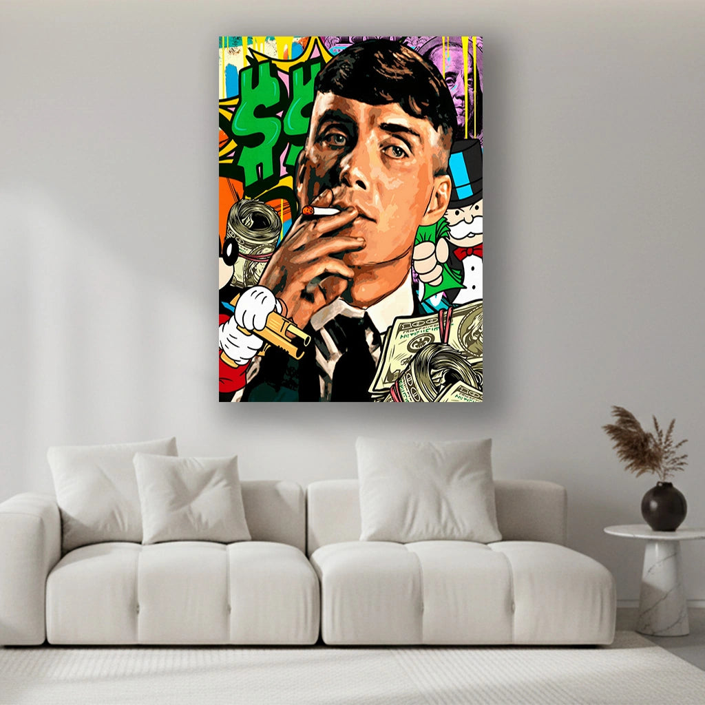 Bold, gritty, and unapologetically stylish, this artwork blends classic gangster cool with explosive pop-art energy. At its center stands a sharp-suited figure radiating confidence and calculated calm, surrounded by graffiti colors, dollar symbols, and playful cartoon hands flashing cash and gold. The fusion of realism and comic motifs creates a dramatic contrast, turning the piece into a visual story of power, hustle, and razor-sharp ambition.
