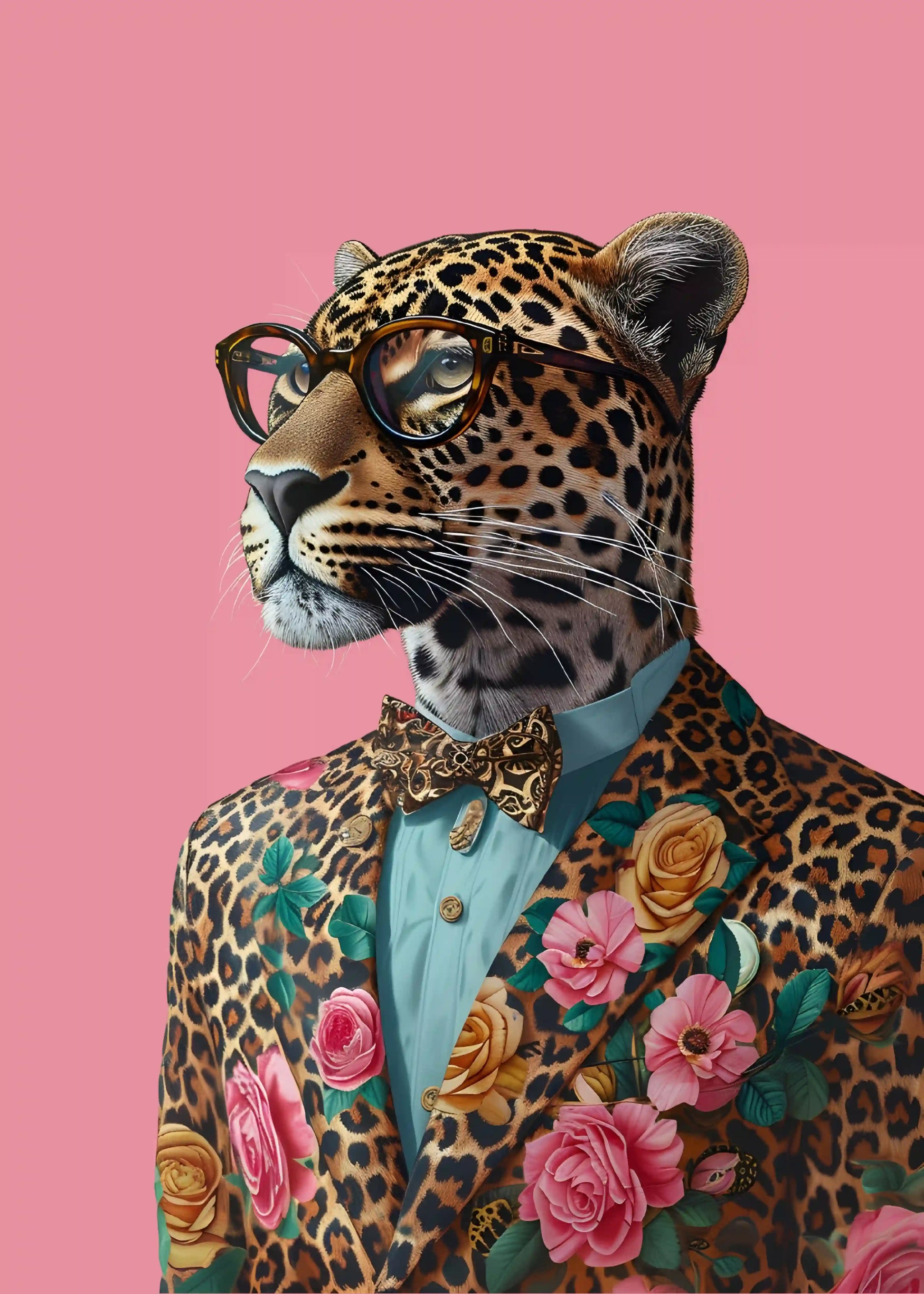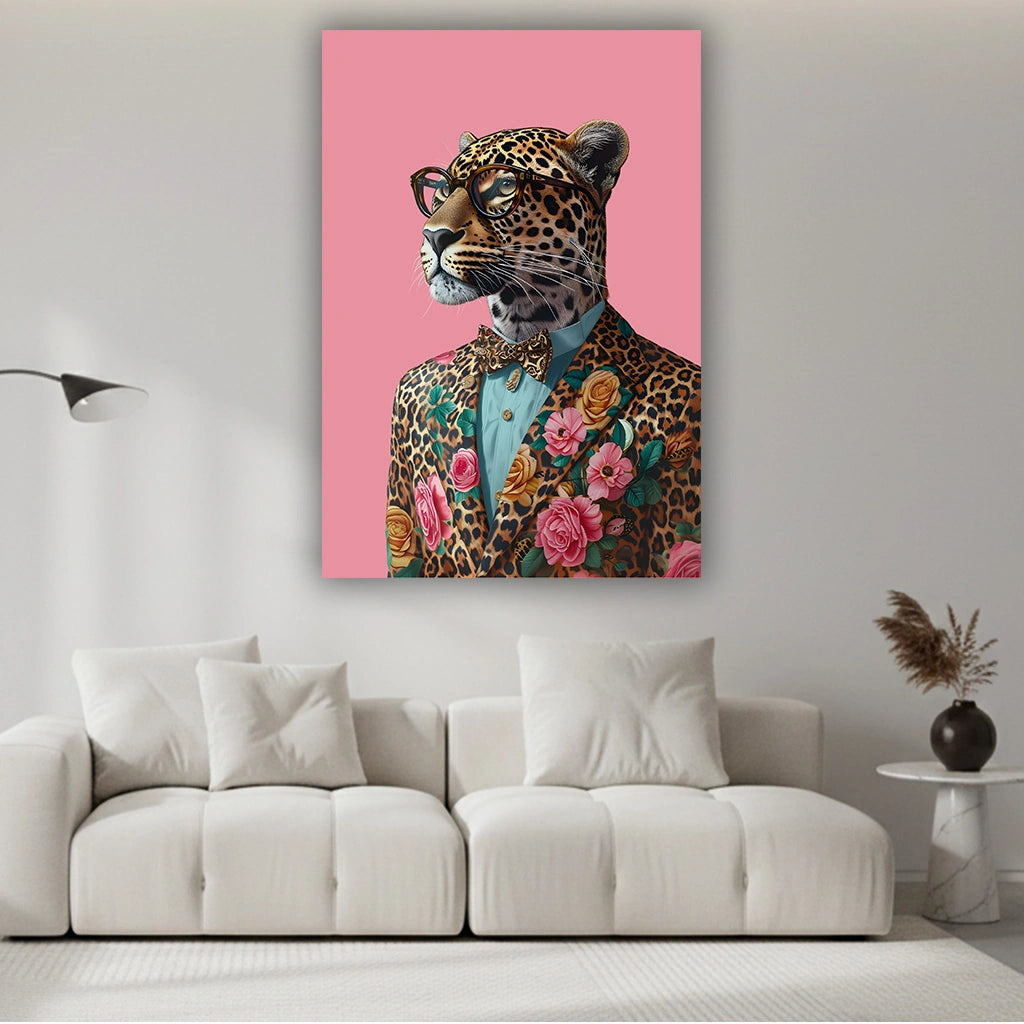 A bold fusion of wild elegance and modern fashion, this artwork features a sharply dressed spotted big cat styled in a floral suit against a soft pink backdrop. The contrast between untamed nature and refined tailoring creates a playful yet sophisticated statement piece that celebrates individuality, confidence, and creative expression.