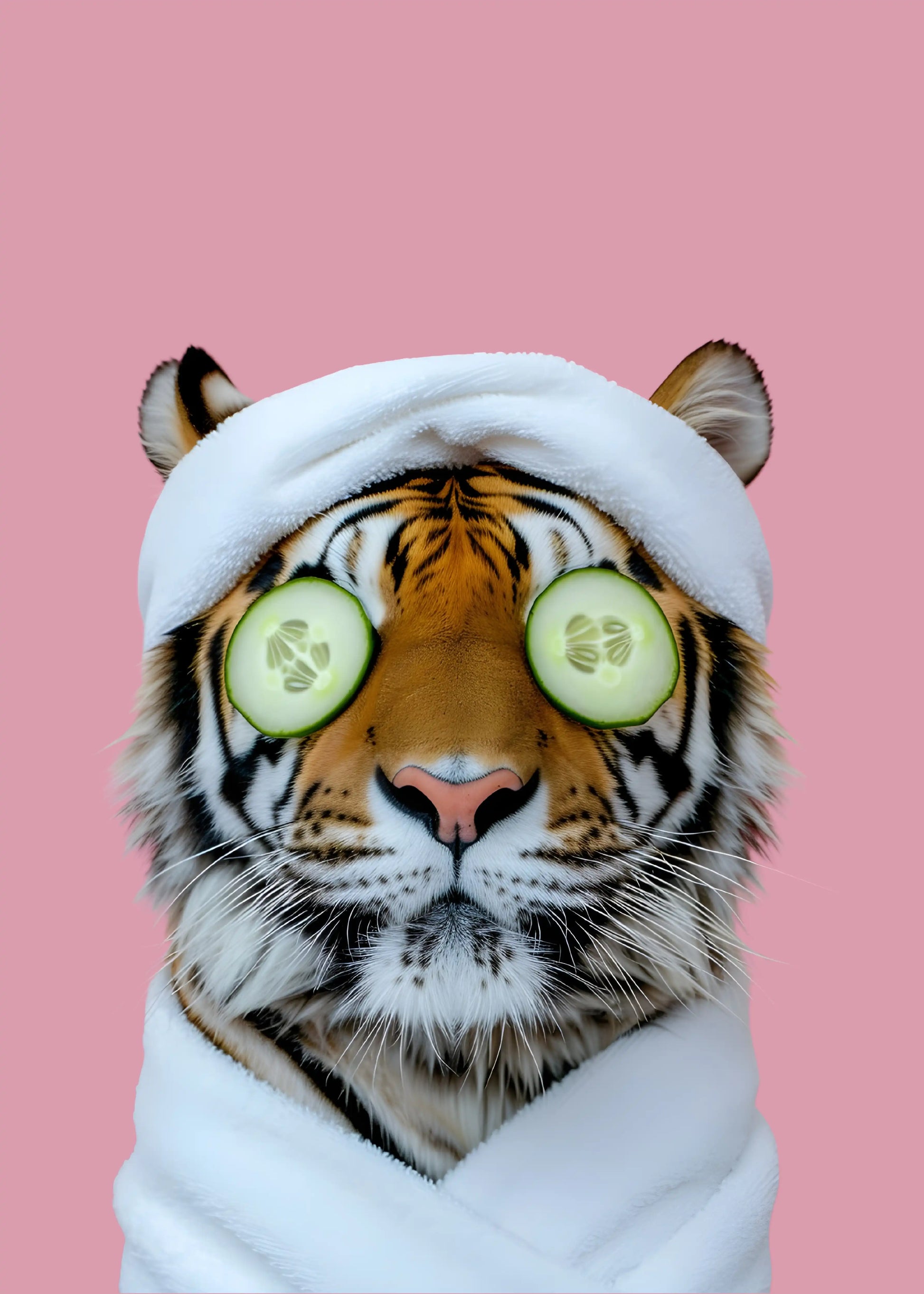 A playful and calming artwork that brings self-care into the wild, featuring a relaxed tiger wrapped in a plush towel with cooling cucumber slices over its eyes. The soft pink backdrop and spa-inspired details create a humorous yet soothing visual that blends wellness culture with modern pop art.