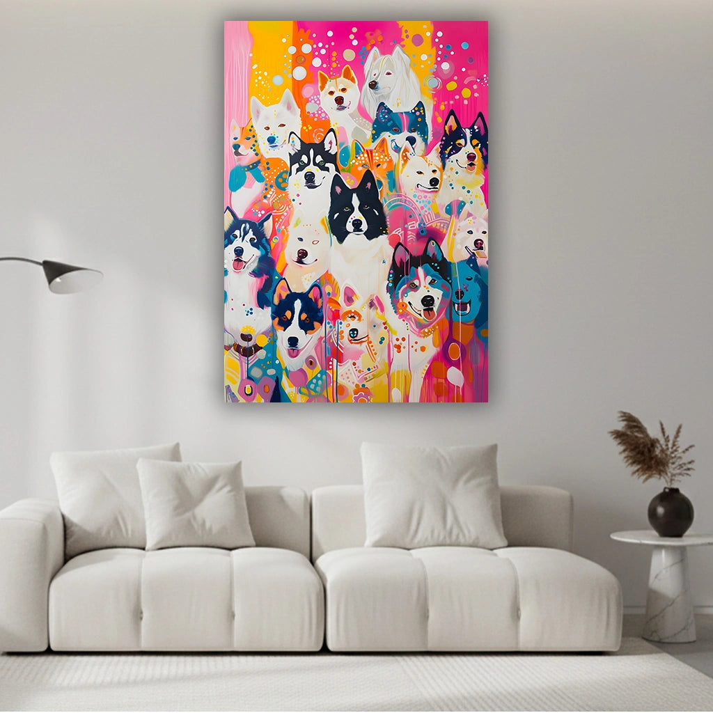 A vibrant celebration of unity, personality, and joyful chaos, this artwork brings together a lively group of dogs painted in bold pop-art colors and expressive brushstrokes. Each face carries its own character, yet together they form a powerful sense of togetherness and warmth.
