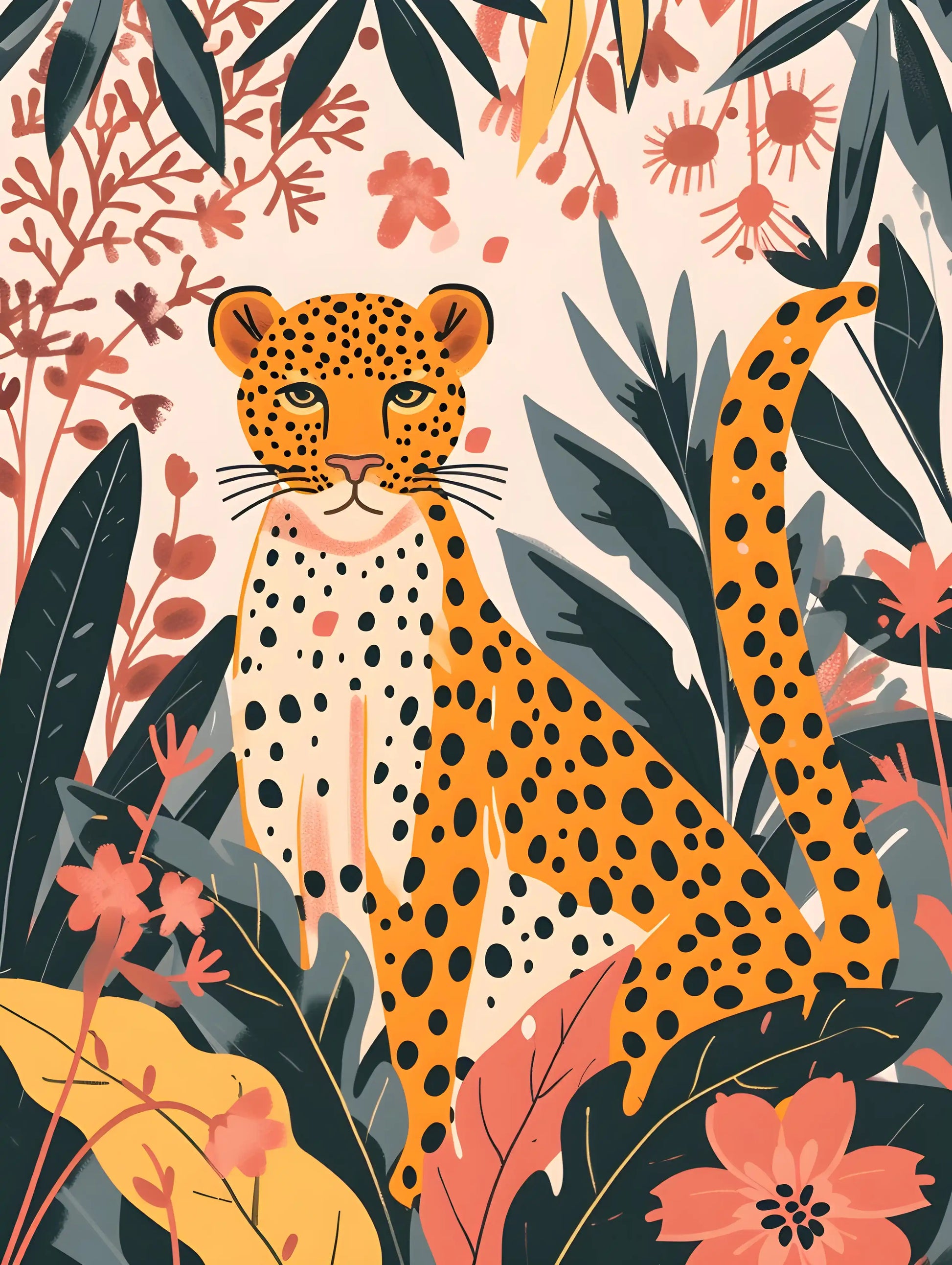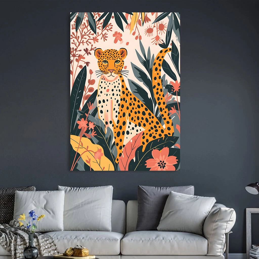 A serene yet powerful cheetah emerges from a tapestry of hand-painted florals, blending speed with softness in a refined, contemporary illustration. The warm earthy palette and elegant detailing make this artwork a striking balance of nature and modern design—perfect for curated interiors that appreciate subtle luxury.