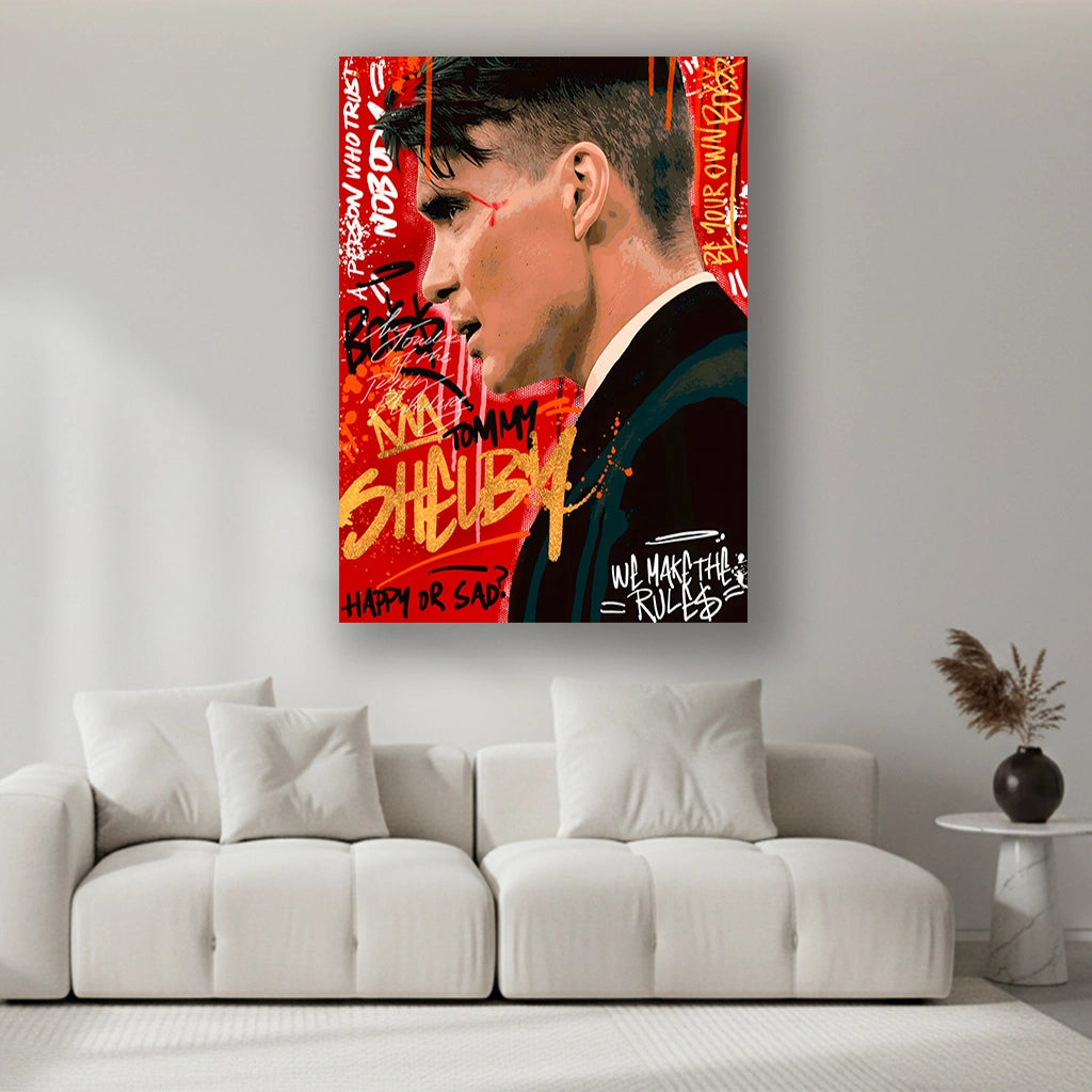This striking artwork captures the intense presence of a sharp-suited crime-era figure, painted in a bold, dramatic style against a blazing red graffiti backdrop. Energetic strokes, scribbled phrases, and gold accents amplify the raw emotion in his expression, blending street art chaos with vintage underworld elegance. The contrast between the clean silhouette and the wild background creates a powerful visual punch, turning the character into a symbol of control, ambition, and inner conflict.