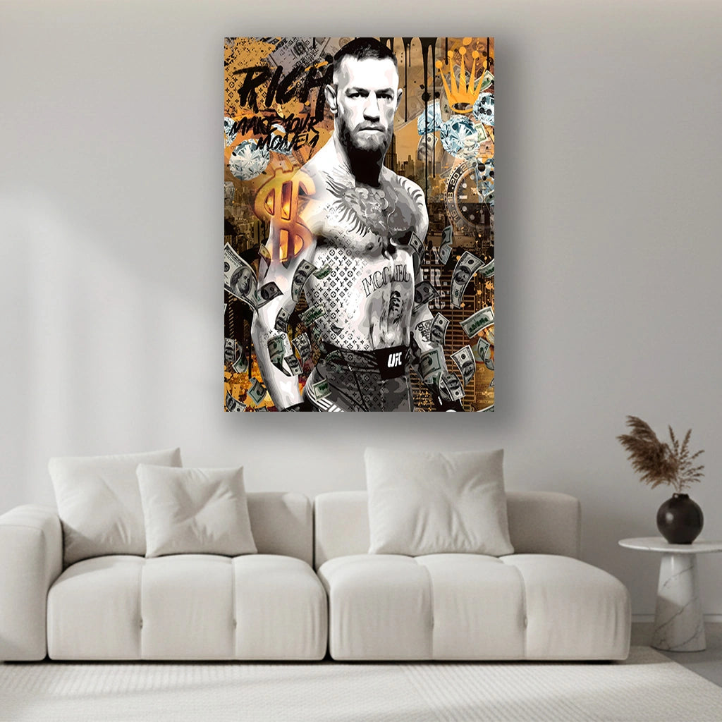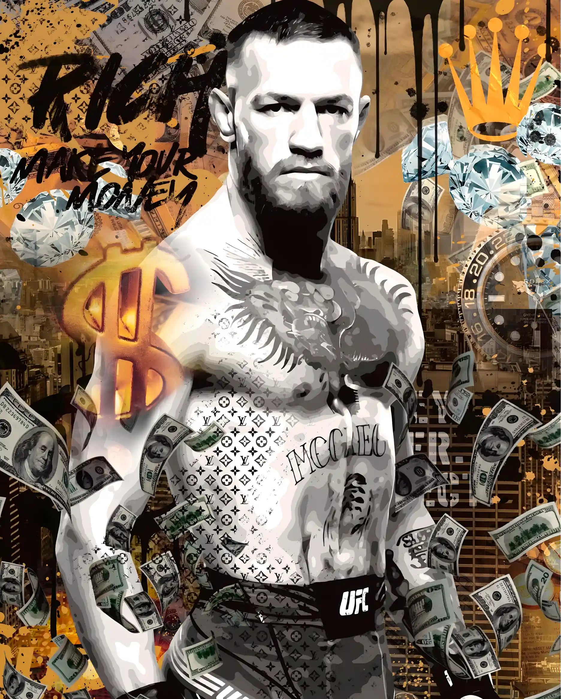 This artwork blends raw athletic power with high-end urban flair, presenting a confident, battle-ready fighter surrounded by symbols of wealth, ambition, and victory. The grayscale portrait contrasts sharply with gold accents, luxury motifs, floating currency, and gritty graffiti textures, creating a dynamic fusion of street attitude and elite energy. The city backdrop and bold graphic overlays amplify the theme of rising to the top through grit, hustle, and fearless determination.