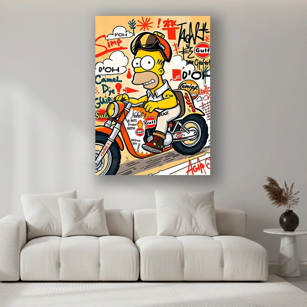 A lively street-pop composition featuring a bold cartoon figure racing through a backdrop of graffiti tags, energetic scribbles, and retro-motorsport patches. The artwork blends humor, motion, and vintage racing culture with an urban pop aesthetic.